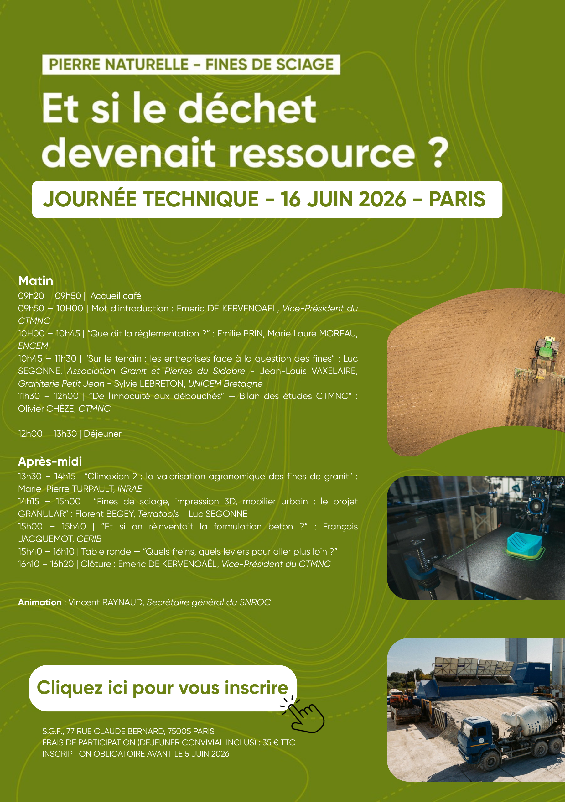 10h45 – 11h30 | « Sur le terrain : les entreprises face à la question des fines » : Luc SEGONNE, Association Granit et Pierres du Sidobre – Jean-Louis VAXELAIRE, Graniterie Petit Jean – Sylvie LEBRETON, UNICEM Bretagne